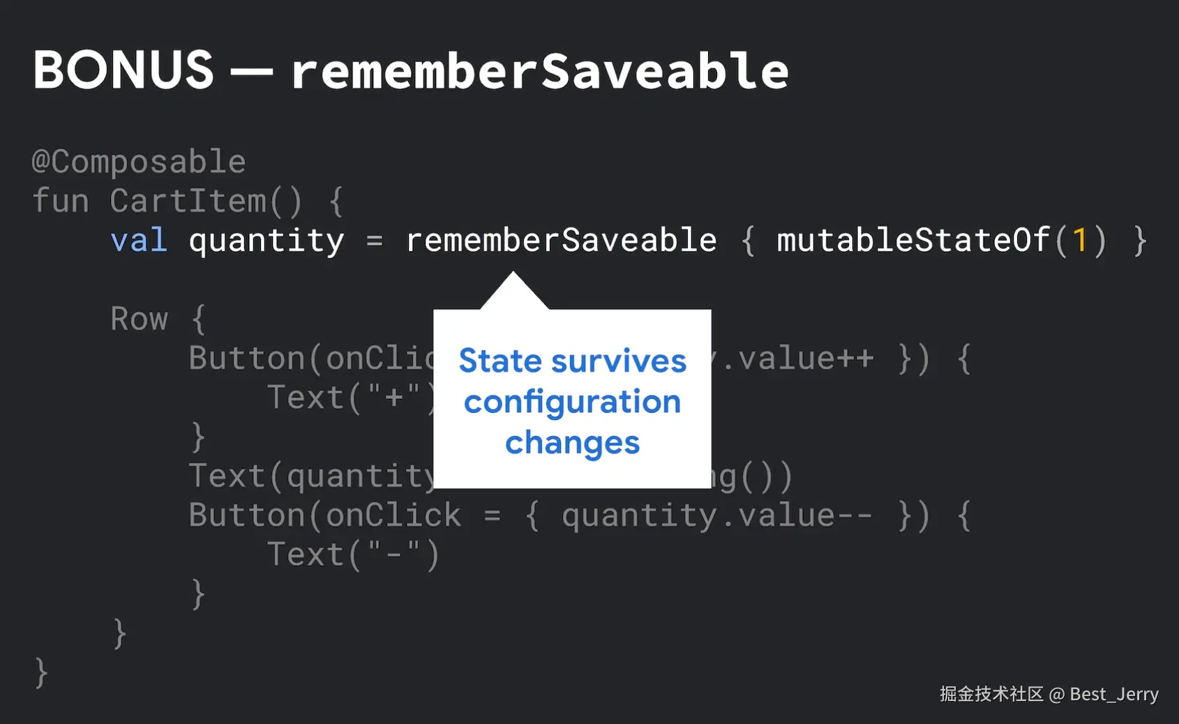 rememberSaveable 适用于界面状态,比如商品数量或选定的标签页,但不适用于过渡动画状态等。