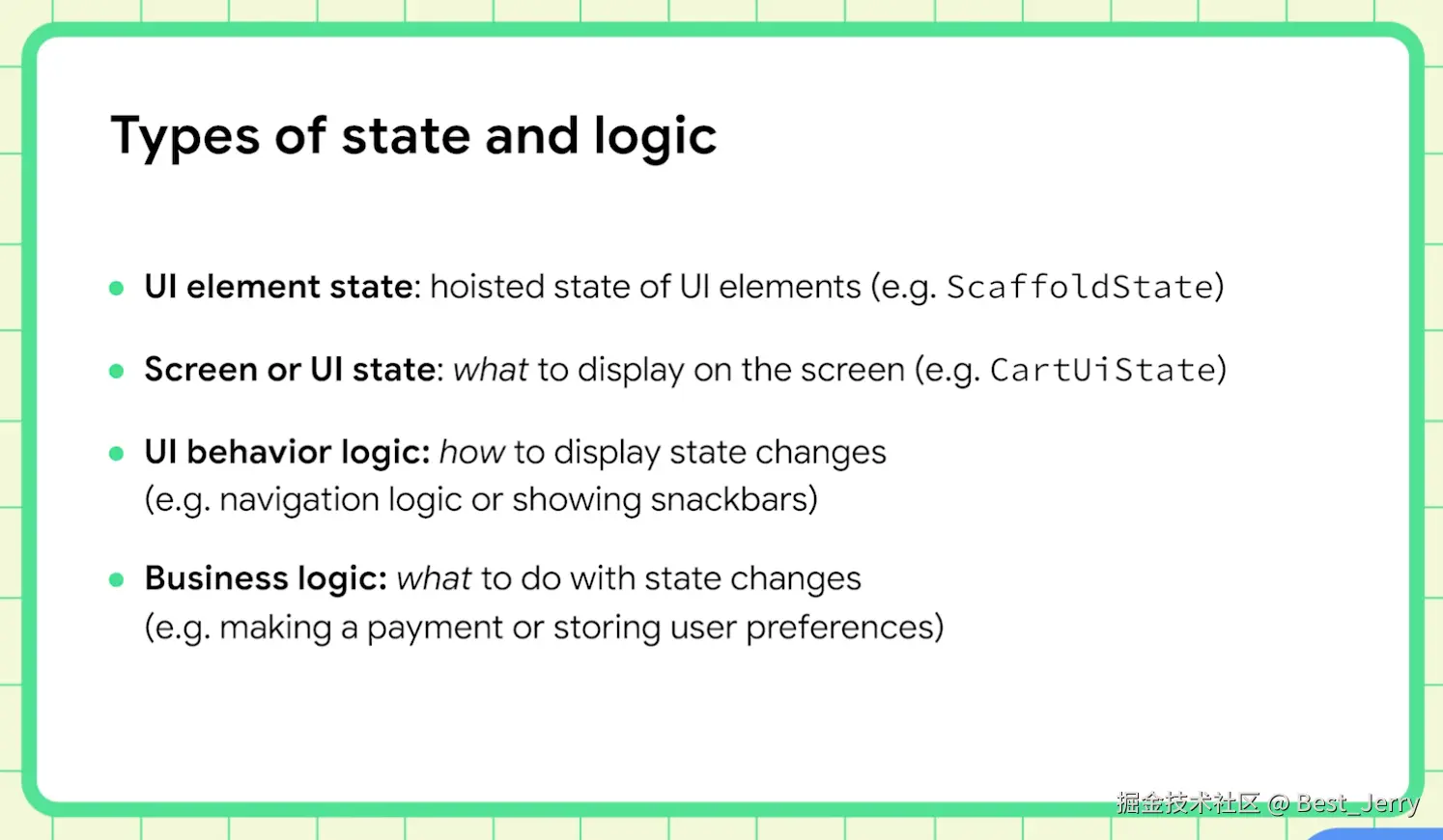 业务逻辑决定着如何处理状态更改,例如,如何付款或存储用户偏好设置,这种逻辑通常位于业务层或数据层,但绝不会位于界面层。