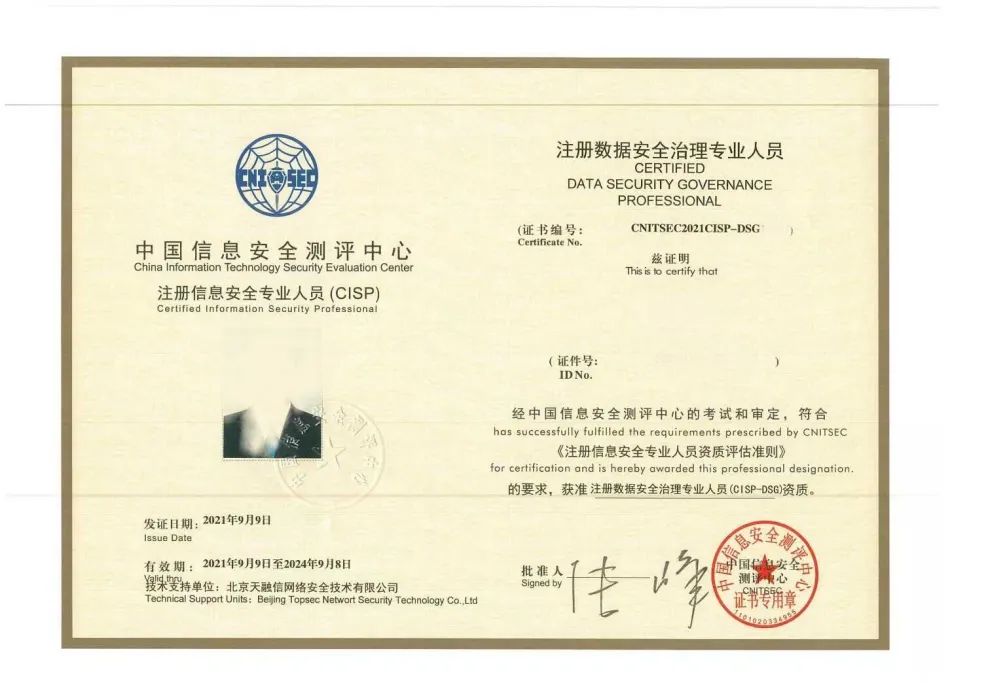 10 CISP-DSG注册数据安全治理专业人员 "注册数据安全治理专业人员",CISP-DSG。 证书持有人具备数据安全治理过程 能力,能帮助各类组织机构解决数据安全顶层设计及管理体系建设的问题,提升国家企事业单位信息安全管理能力 。 (CISP-DSG报考无学历与工作经验要求 )