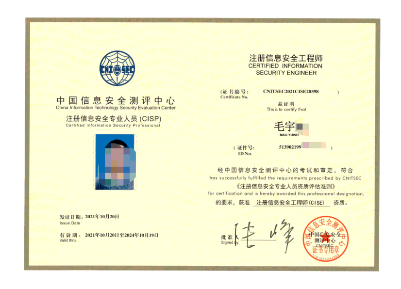 CISE,中文名称为注册信息安全工程师。 证书持有人员主要从事信息安全技术领域 的工作,具有从事信息系统安全集成、安全技术测试、安全加固和安全运维的基本知识和能力。