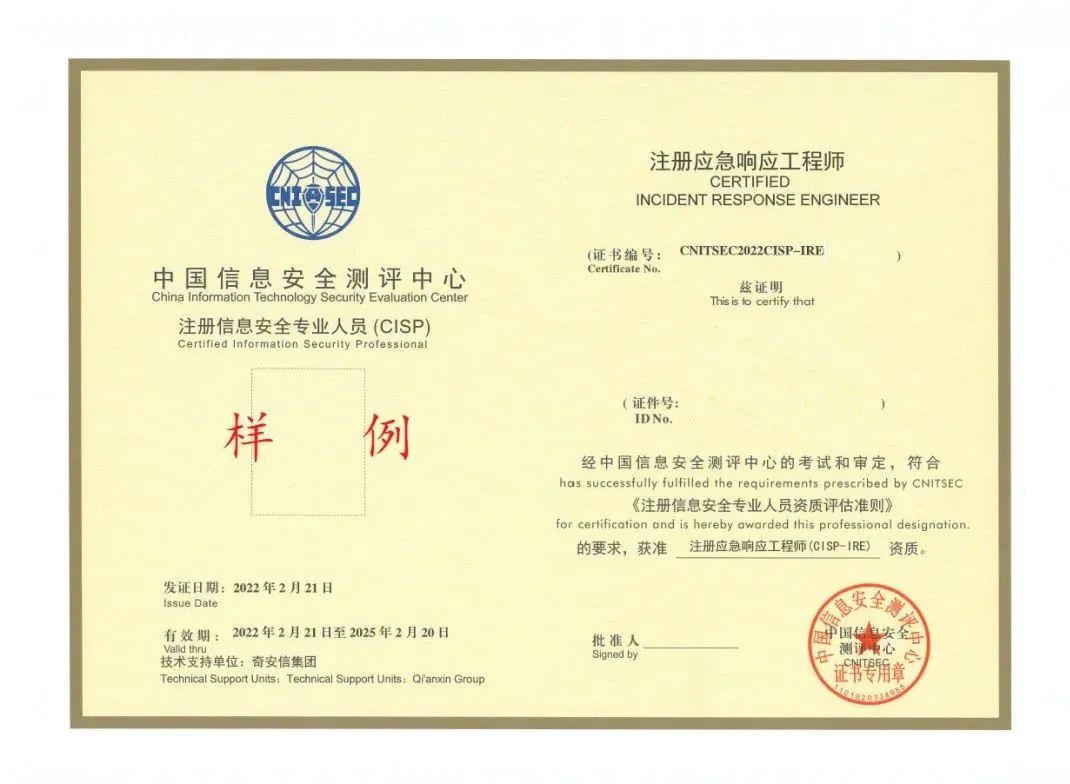 CISP-IRE,即国家注册信息安全应急响应工程师认证。 证书持有人员主要从事信息安全技术领域应急响应 工作,具有了解应急响应概况、应急响应基础、应急响应事件监测、应急响应事件分析和处置 的基本知识和能力。
