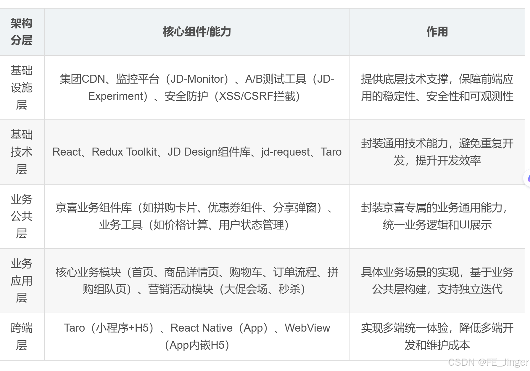 | 基础技术层 | React、Redux Toolkit、JD Design组件库、jd-request、Taro | 封装通用技术能力,避免重复开发,提升开发效率 |