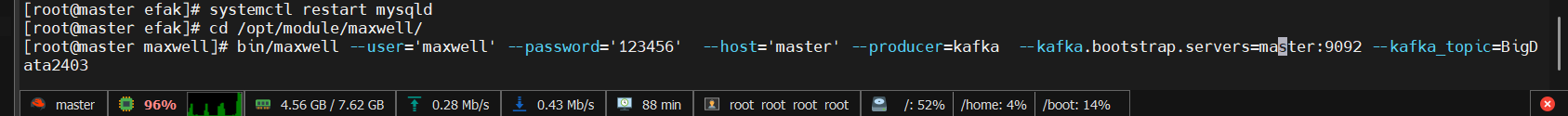 bin/maxwell --user='maxwell' --password='1234' --host='master' --producer=kafka --kafka.bootstrap.servers=master:9092 --kafka_topic=BigData2403