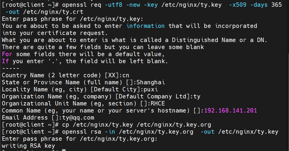 创建证书文件:/etc/nginx/ty.crt,命令如下,设置相关信息