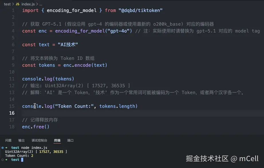 在 Web 开发或 Node.js 环境中,我们通常使用 npm 包 @dqbd/tiktoken 来在本地计算 Token 数,这比每次调用 API 估算要快得多,也更省钱。