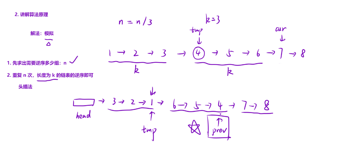 这个解法的核心是 「分组局部翻转 + 整体衔接」,步骤拆解: