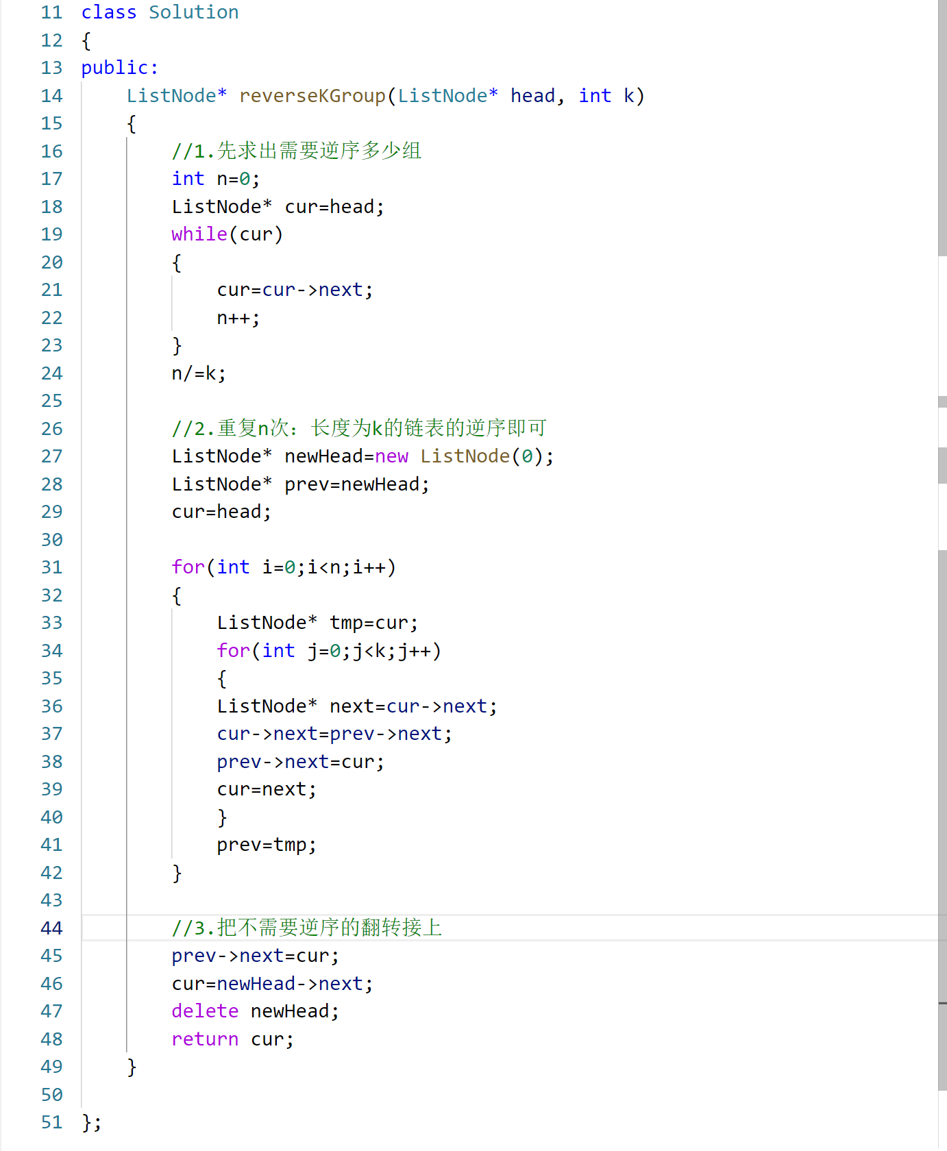 - 时间复杂度:O (n),n 为链表总长度。遍历链表 2 次(1 次统计长度,1 次翻转所有节点),每组翻转 k 个节点的总操作数为 n;