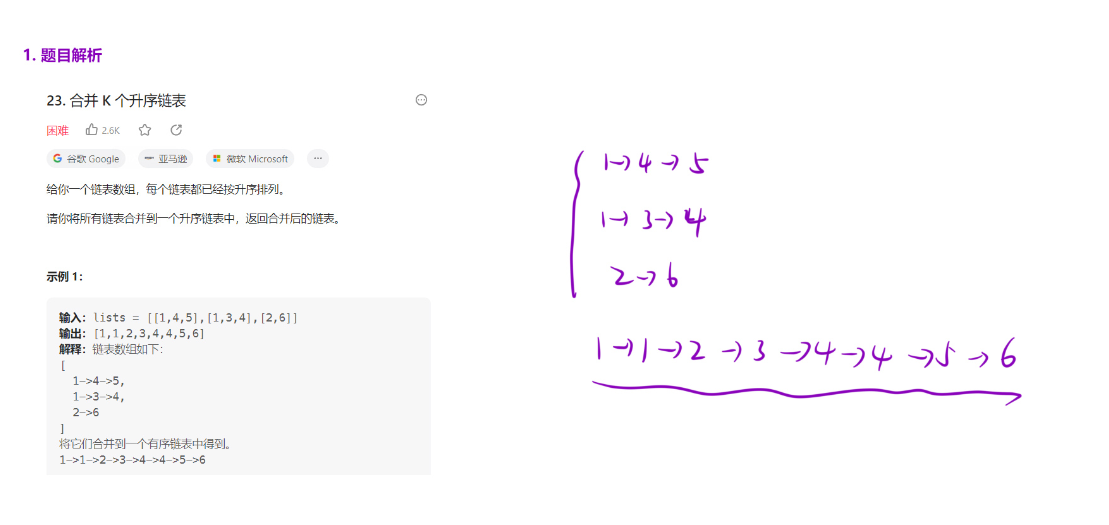 示例 1 输入:lists = [[1,4,5],[1,3,4],[2,6]](3 个升序链表),核心流程如下: