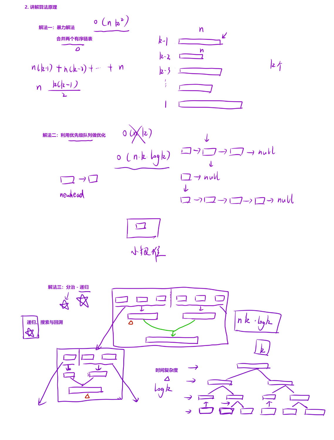 log k(比如k=3时,递归深度为 2),栈空间为 O (log k)。 - 额外空间:除了递归栈,没有使用其他额外空间(虚拟头节点是栈上对象,不占额外堆空间),因此空间复杂度为 O (log k)。