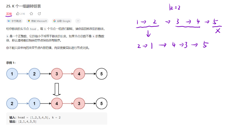 - 衔接剩余节点:最后一组翻转后,将剩余未翻转的节点接在链表尾部。