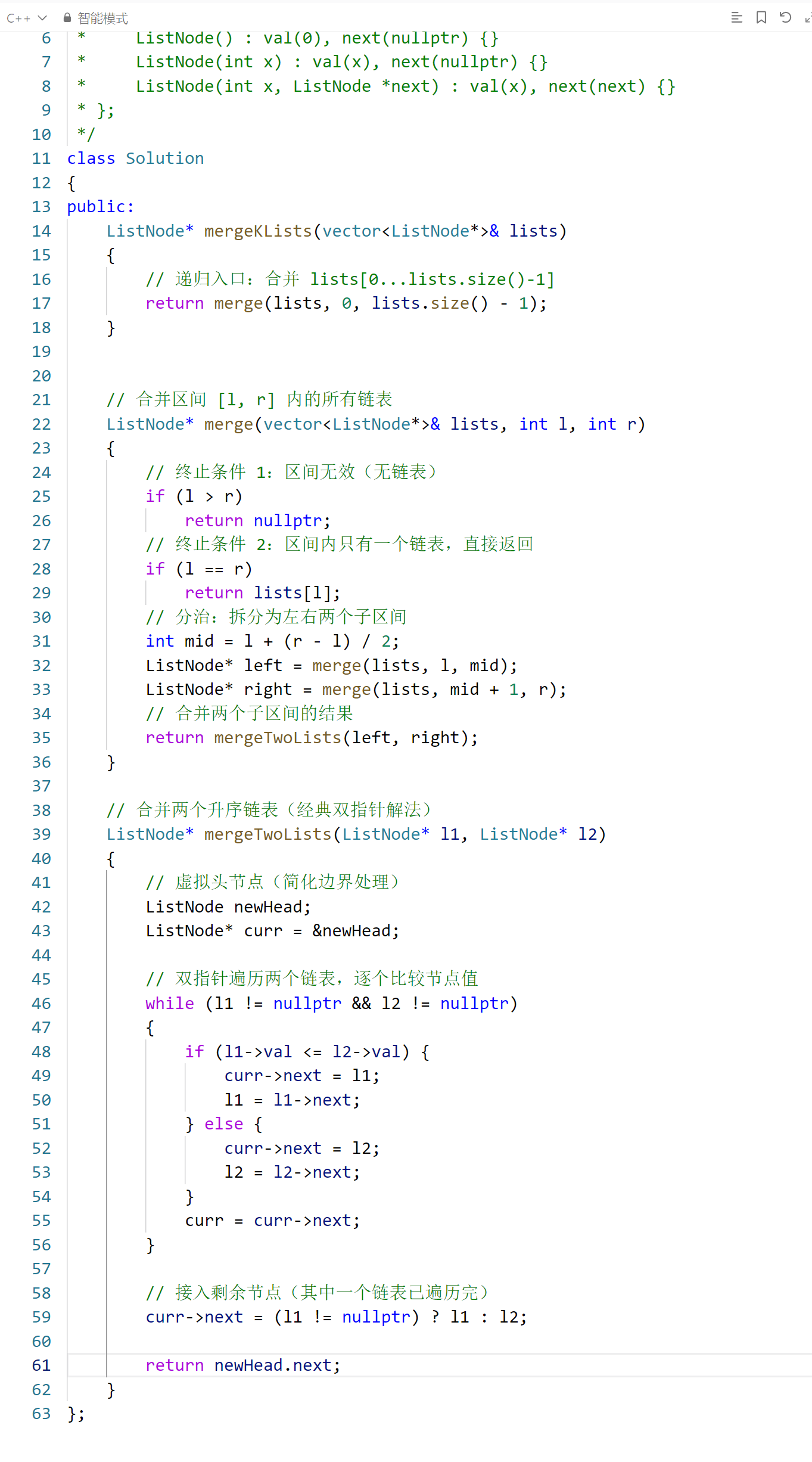这段代码是 合并 K 个升序链表 的经典分治解法,核心思路是将 "多链表合并" 拆解为 "两两链表合并",利用递归分治降低时间复杂度。下面从「代码结构」「核心逻辑」「细节解析」「复杂度分析」四个维度完整解析: