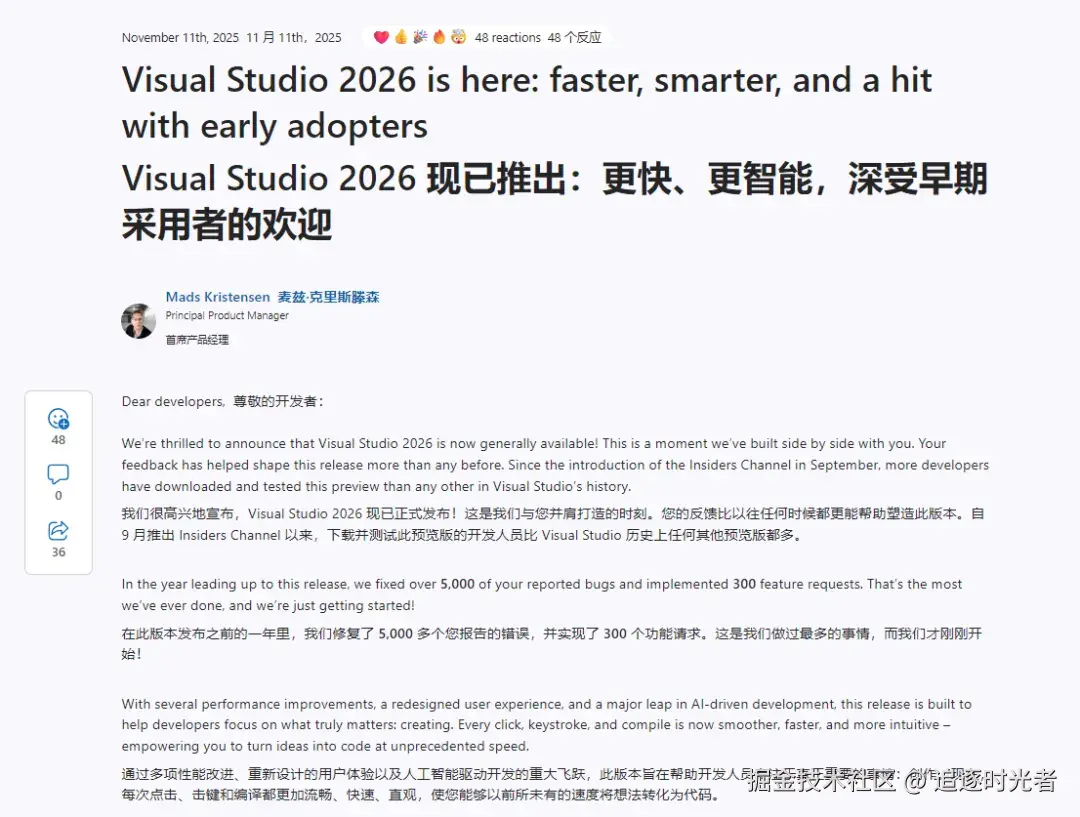 - 文章简介: Visual Studio 2026 已于本月正式推出,微软近日宣布将调整 Visual Studio 的发布周期。自 Visual Studio 2017 以来,微软已逐步加快更新节奏,而此次调整将进一步推动 IDE 的现代化,持续提供最新特性,同时保持企业级稳定性。根据新的支持模式,Visual Studio 后续将采用与.NET 类似的支持策略:每月提供功能更新,每年 11 月发布新的年度大版本更新,并提供一年功能更新支持与一年安全支持。