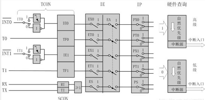 - EX1:外部中断 1 的分允许位(图中设为 1):逻辑同 EX0。