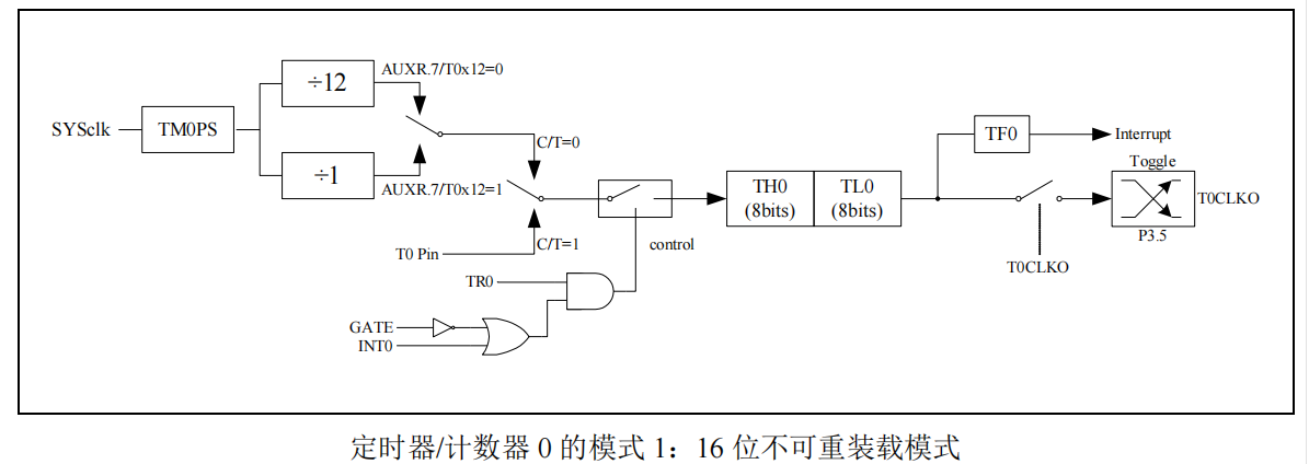 - 功能:这是传统 51 单片机的兼容分频方式------ 系统时钟(SYSclk)先除以 12,再作为定时器 0 的计数脉冲