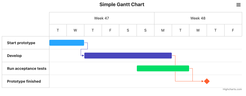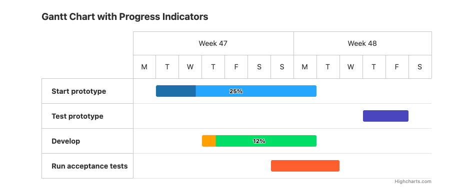 使用进度条可以快速了解任务的完成百分比。通过在 completed 点设置 series.data 属性,将普通任务变成进度条。该属性接受一个包含选项 fill 和 amount 的对象,用于设置对比色和完成百分比。 completed 属性也可以直接用0到1之间的十进制值设置。然后它会设置 amount 属性,并自动选择自然对比色应用fill 颜色。