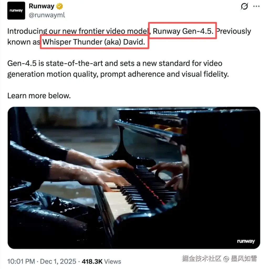 2025 年 12 月 1 日,Runway 正式发布了新一代模型 Gen-4.5。如果你关注过他们内部的动向,可能听说过这个代号------"David"(大卫)。这可不是随便起的名,它是《圣经》里"大卫战胜巨人歌利亚"的那个大卫。