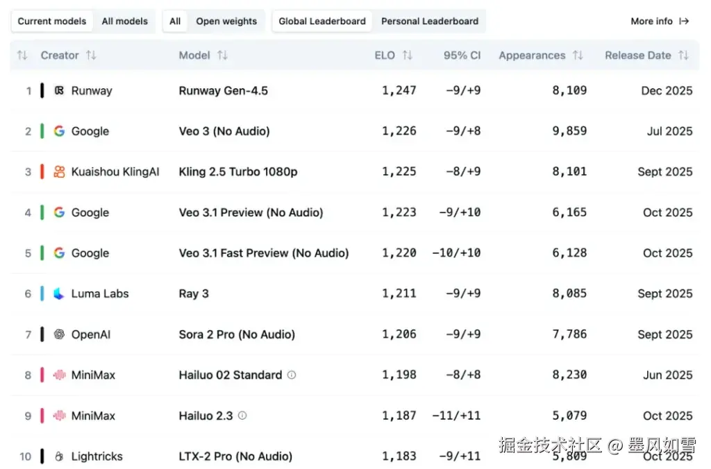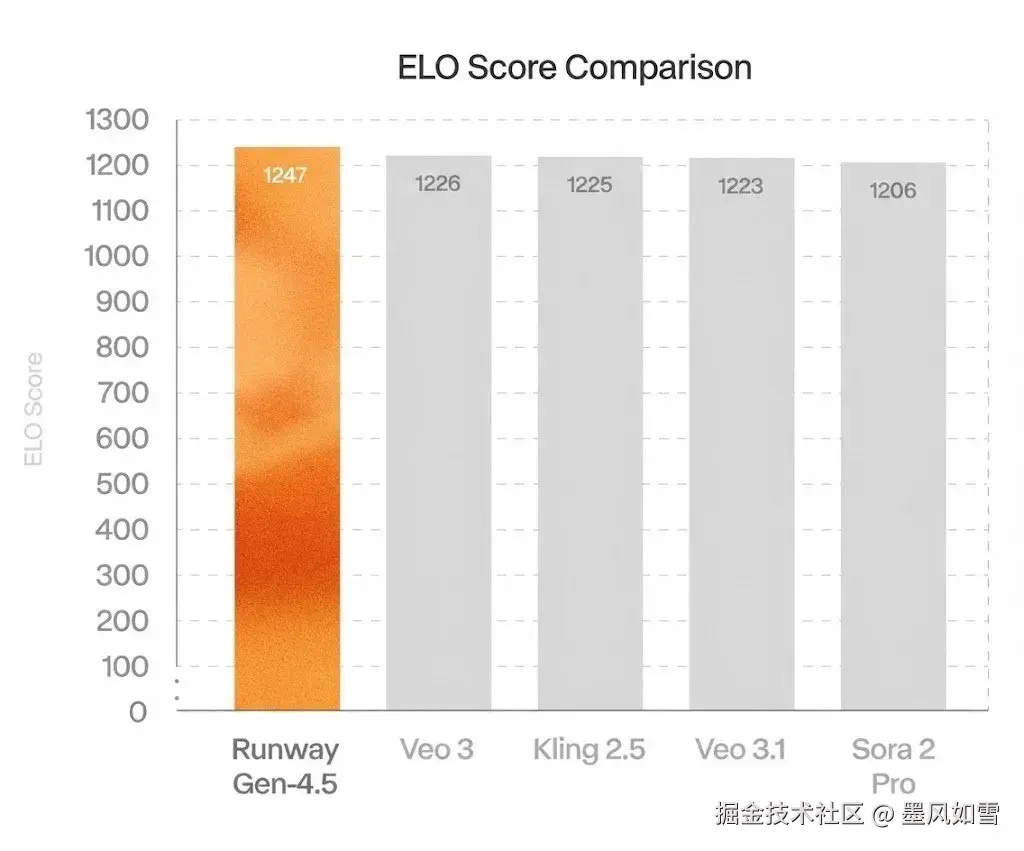 这个分数意味着什么?意味着它把谷歌引以为傲的 Veo 3(1226分)和 OpenAI 的 Sora 2 Pro 都甩在了身后。要知道,这是一个"盲测"榜单,评测者在不知道模型名字的情况下,纯凭肉眼判断视频质量。在这种硬碰硬的较量中拿到第一,说明 Gen-4.5 的视觉观感确实更加讨好人类眼球。