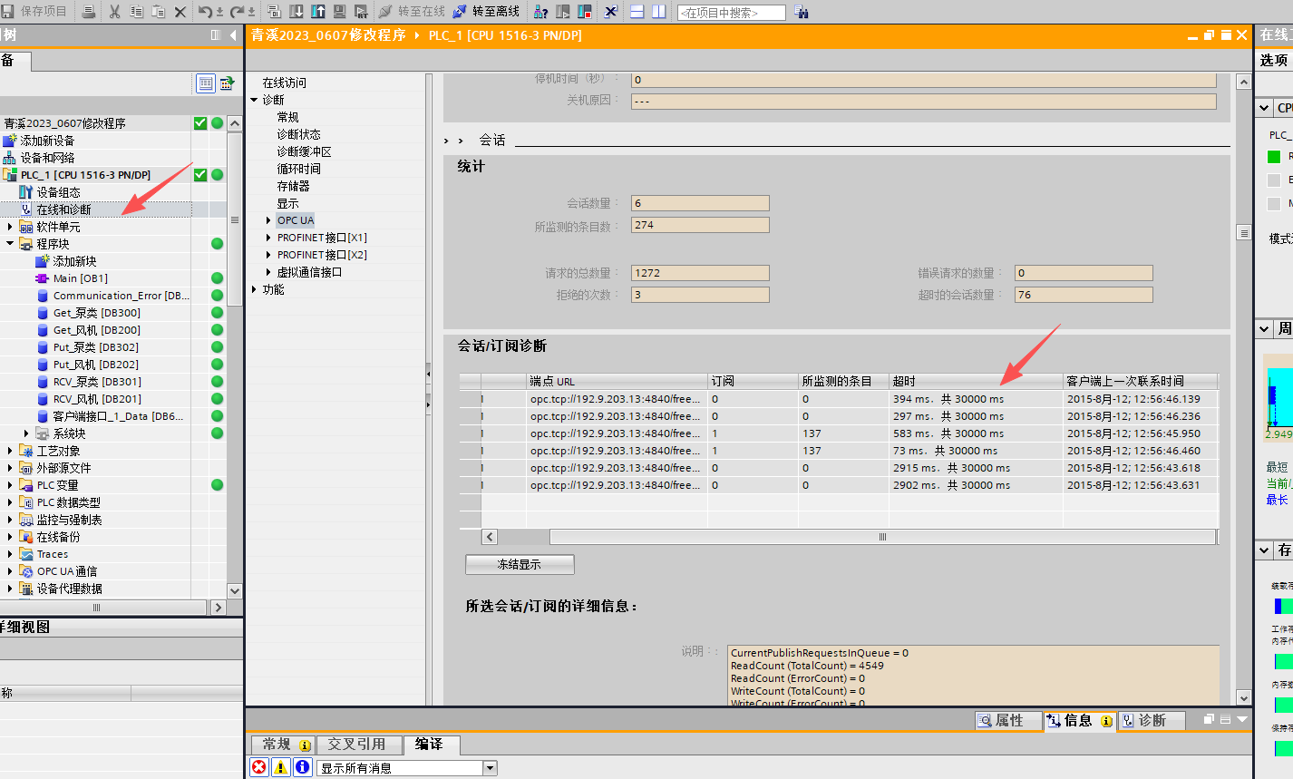 重点通过博途软件查看,查看到opcua的链接数,链接数多少都没问题,问题在于链接到代码中,有循环不停的通过opcua读取点位,没有失眠或者延时过,造成plc堵塞操作了,解决问题,就是循环读取点位添加延时