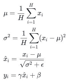 其中,H 是特征维度的大小,μ和σ2是沿着特征维度计算的均值和方差,γ和β是可学习的缩放和平移参数,ϵ是一个小常数,用于防止除零错误。