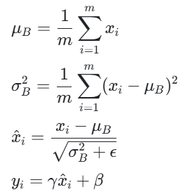 其中,μB和σB2是小批量数据的均值和方差,x^i是标准化后的值,γ和β是可学习的缩放和平移参数,ϵ是一个小常数,用于防止除零错误。