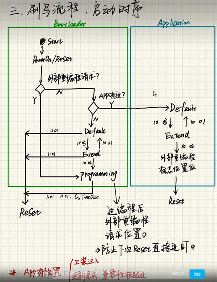 如果没有外部重编程请求,且APP有效,这时候就进入APP里的默认会话,在APP默认会话里请求10 03进入扩展会话,扩展也可以请求10 01进入默认会话,但是扩展会话请求10 02以后,就会把外部重编程位置1,也就是外部重编程有效,这时候再进行Reset操作,Reset相当于是一个开关,然后流程重新开始,外部重编程有效,进入BT里面的编程会话,就开始升级操作,升级完成后然后进行reset。