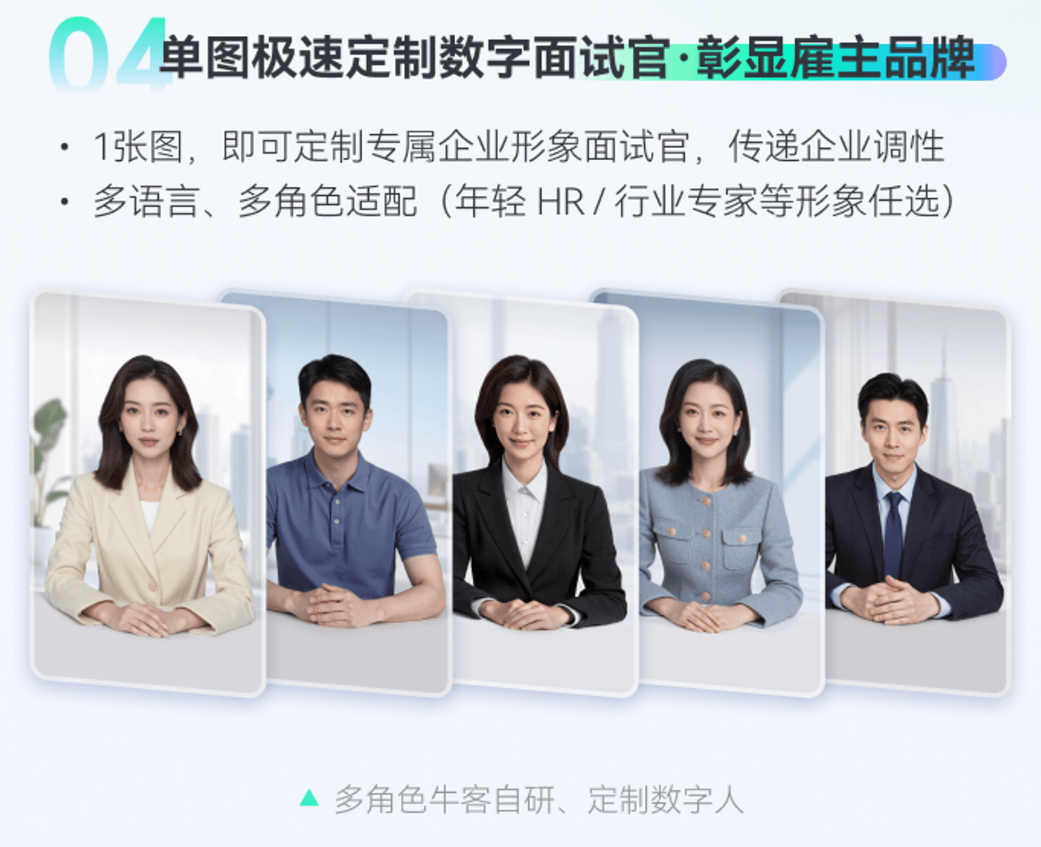- 极速定制数字人服务:仅需上传企业LOGO或形象素材,即可生成专属品牌形象面试官,支持多语言切换与角色设定(如年轻HR/行业专家),强化雇主品牌感知。