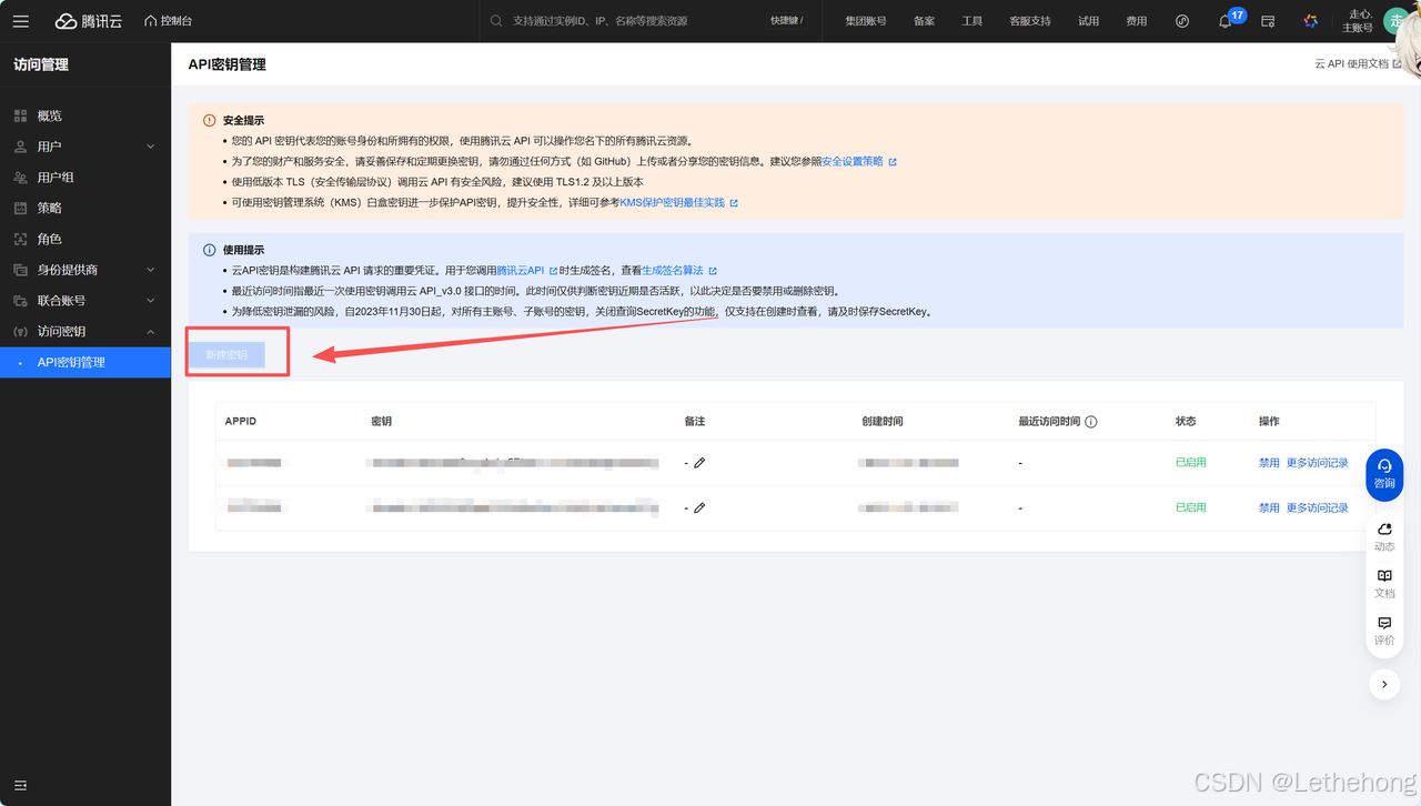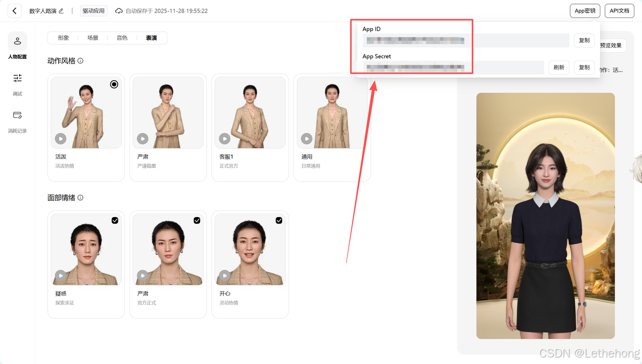 进入之后,点击API密钥,查看数字人实时驱动SDK连接参数 App ID、App Secret