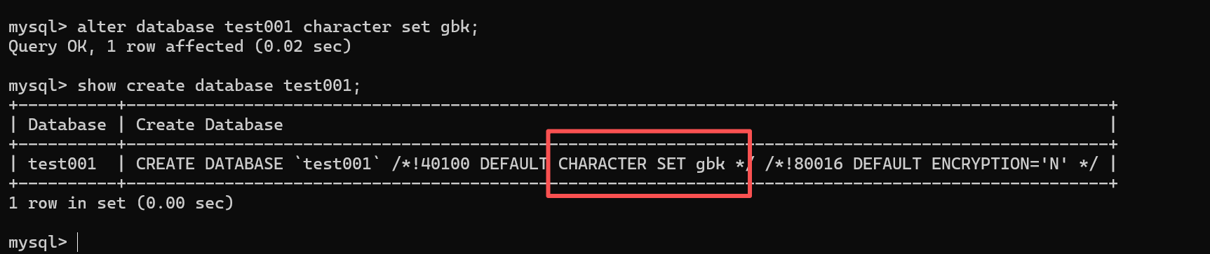 CREATE DATABASE test001 /*!40100 DEFAULT CHARACTER SET gbk */ /*!80016 DEFAULT ENCRYPTION='N' */
