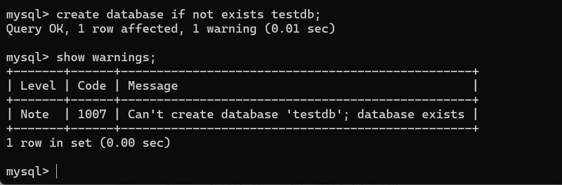 | Note | 1007 | Can't create database 'testdb'; database exists |
