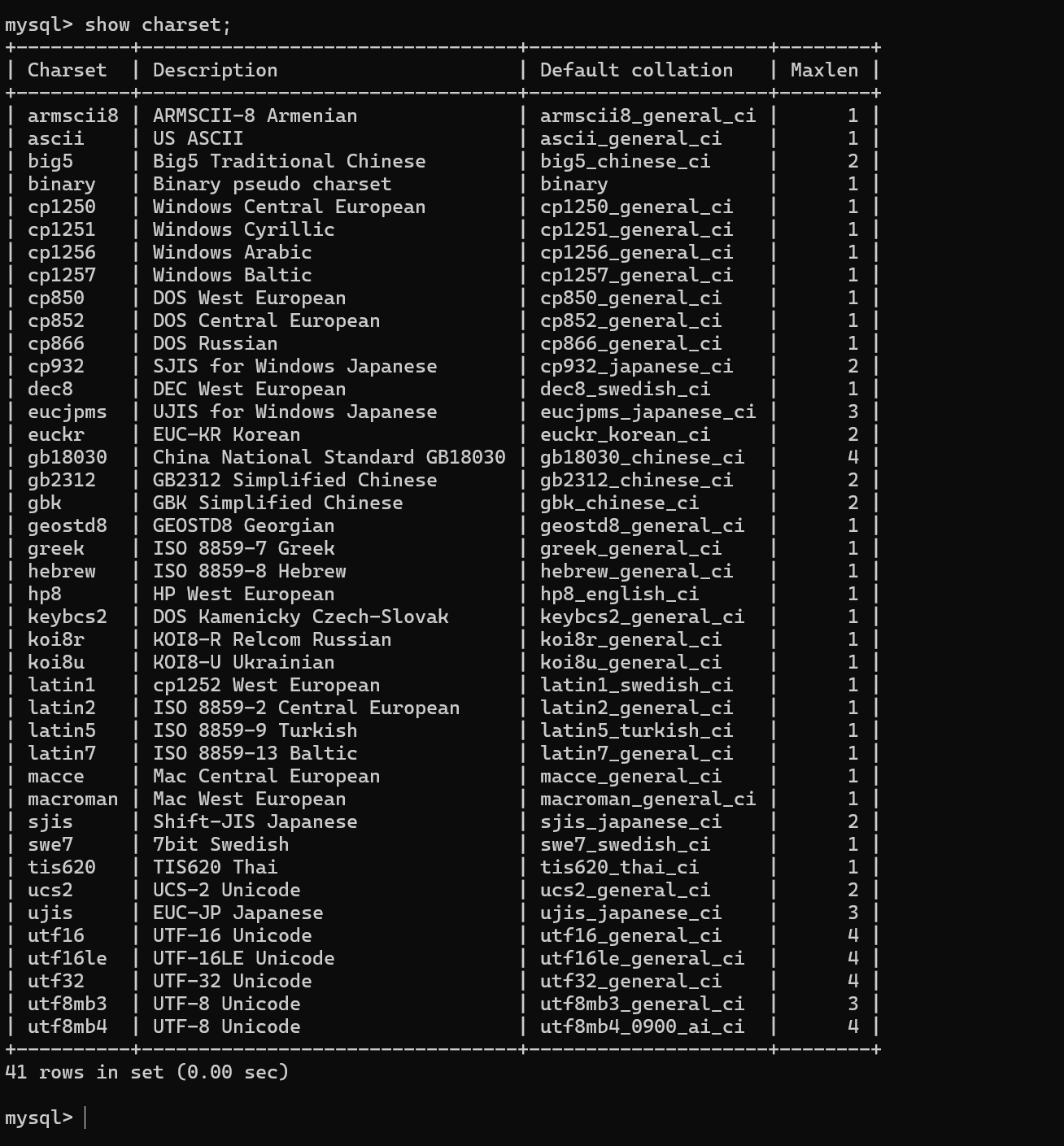 - 默认值: MySQL 8.0 默认的字符集编码是