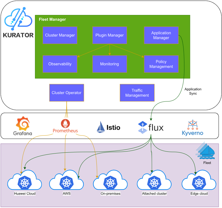 Kurator正是在这一背景下应运而生。作为华为云开源的分布式云原生平台,Kurator融合了众多主流的云原生软件栈,如Kubernetes、Istio、Prometheus等,旨在帮助用户构建和管理自己的分布式云原生基础设施。 其核心价值在于将分散的云原生技术整合为有机整体,通过统一的控制平面实现跨集群、跨地域、跨云的资源协同管理。
