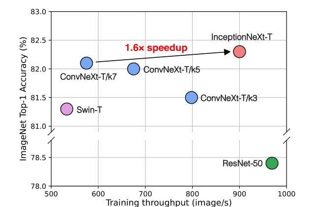 Our InceptionNeXt-T enjoys both ResNet-50's speed and ConvNeXt-T's accuracy.