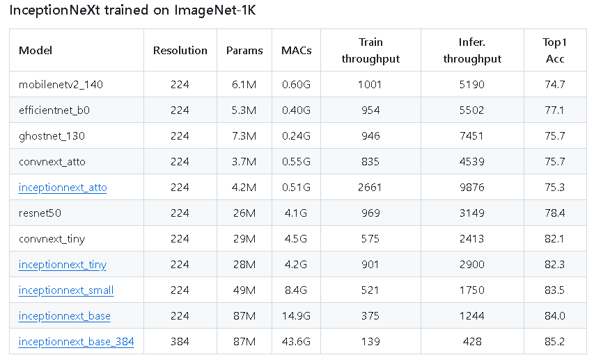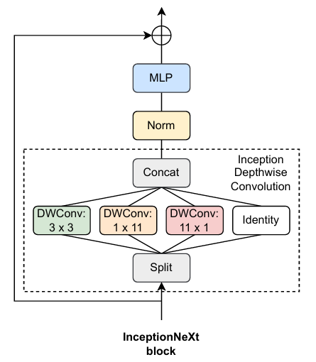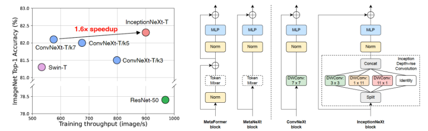 - MetaNeXt 的模块化理念 :MetaNeXt 强调通过灵活的模块组合与结构调整适配不同视觉任务,打破了传统 CNN 中固定模块的束缚。InceptionNeXT 在此基础上进一步聚焦,将模块化设计理念针对性地应用于大核卷积的改造,打造出兼具通用性与高效性的核心模块。