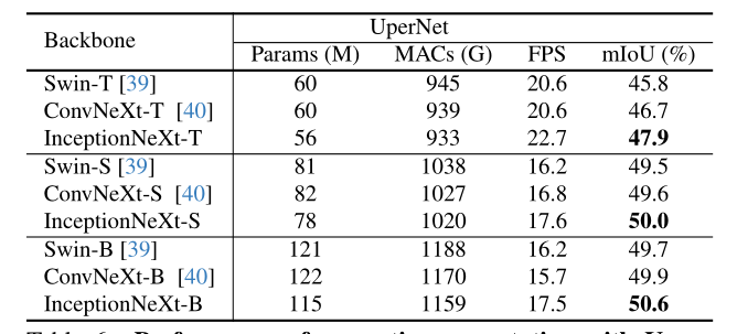 以 InceptionNeXT 为骨干网络搭建分割模型,在公开语义分割数据集上的表现同样出色。相较于 ConvNeXt 同级别模型,其分割 mIoU 稳步提升,尤其对道路、电线杆等长条状目标以及小尺寸目标的分割精度提升明显。同时,得益于高效的架构设计,模型推理速度提升 15% 以上,能够更好地适配实时语义分割等对速度要求较高的场景。