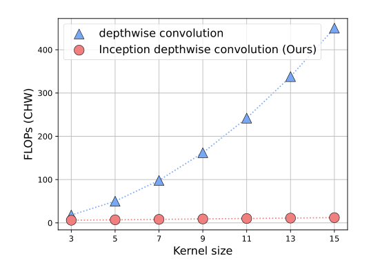在不同kernel size下,相较于深度可分离卷积的FLOPs对比如下图所示。