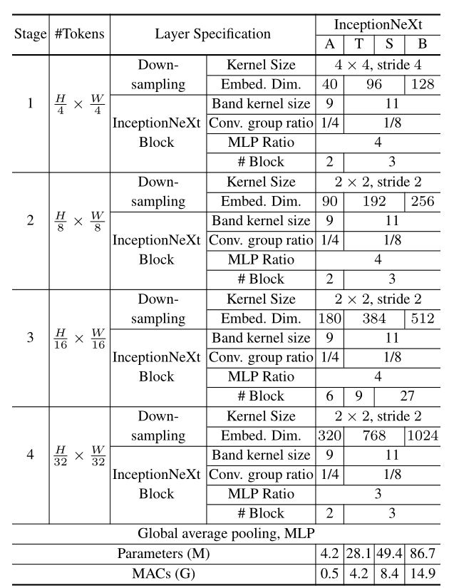 基于 Inception 深度卷积这一核心模块,InceptionNeXT 构建了完整的端到端网络,其整体设计依旧沿用4阶段框架,在最新v3版本的论文中,给出了4个变体A(Atto)、T(Tiny)、S(Small)、B(Base)的具体参数,如下表所示。其中,对于A变体,4个stage repeat数量依次为[2, 2, 6, 2],T变体为[3, 3, 9, 3], S和B变体依次为[3, 3, 27,3]。由于强调速度,采用批量归一化,与ConvNeXT的区别是,InceptionNeXT在stage 4中,使用3的MLP比率。另外,采用 GELU 激活函数替代传统 ReLU,其平滑的梯度特性能够增强模型的非线性表达能力,避免 ReLU 在负区间梯度为零的问题;每个卷积层后搭配 BatchNorm 归一化层,加速模型收敛,降低过拟合风险,提升训练稳定性。