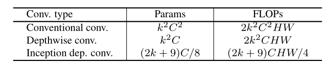 常规卷积、深度可分离卷积和Inception深度卷积三种卷积的复杂度、参数量如下表所示。可以看出,Inception深度卷积相较于其他两种卷积范式从计算量和参数量角度来看,更高效。