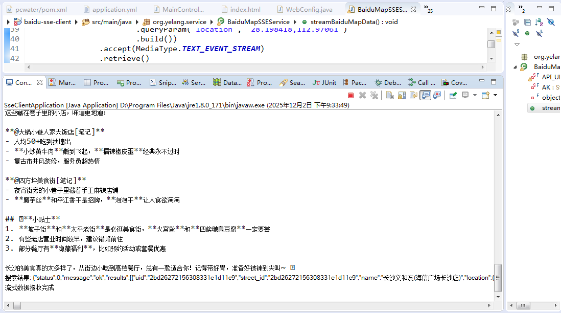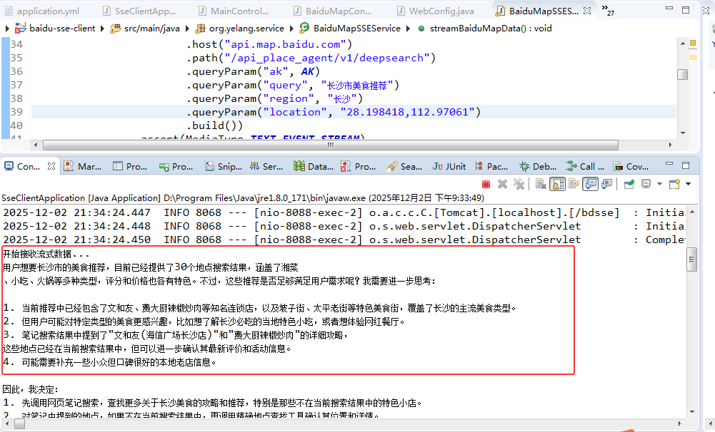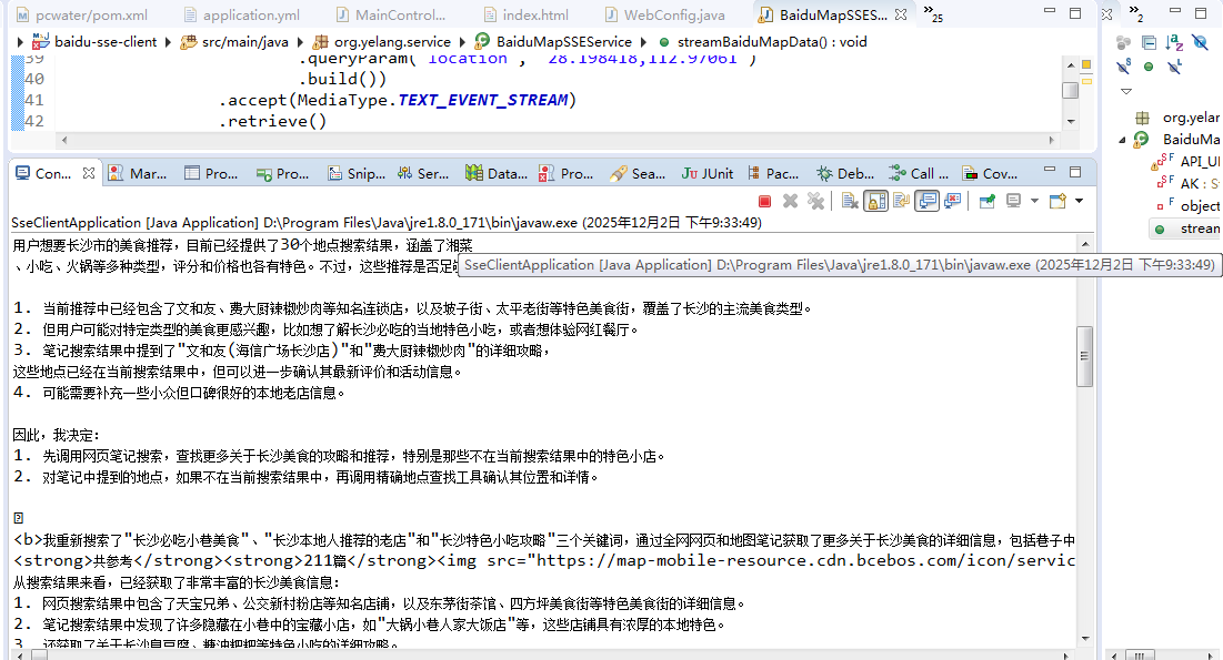这里我们默认以检索长沙的美食推荐作为背景,实现长沙市内的美食推荐。如果服务连接成功,百度地图会通过SSE协议将数据返回给我们的Client,Client则可以接收到具体的数据,从而完成深度检索的功能。