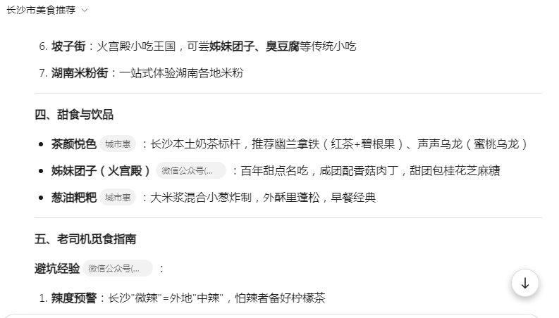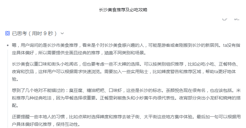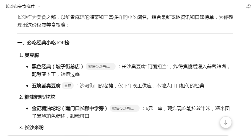 本节将以查询"长沙市美食推荐"为例,对比我们的百度深度检索输出、DeepSeek以及Kimi的检索能力。