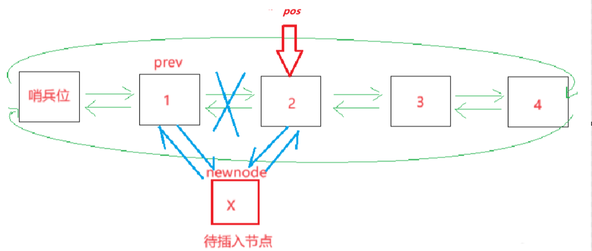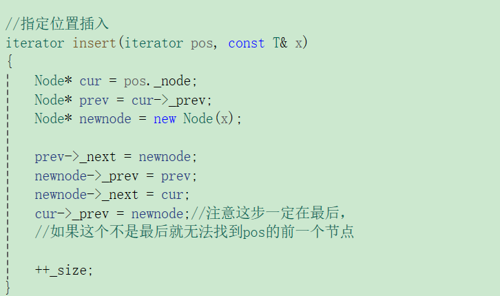 思路:首先依据要插入的数据new出一个新节点newnode,然后将pos节点和pos的后一个节点和新节点newnode相连,最后++_size即可。