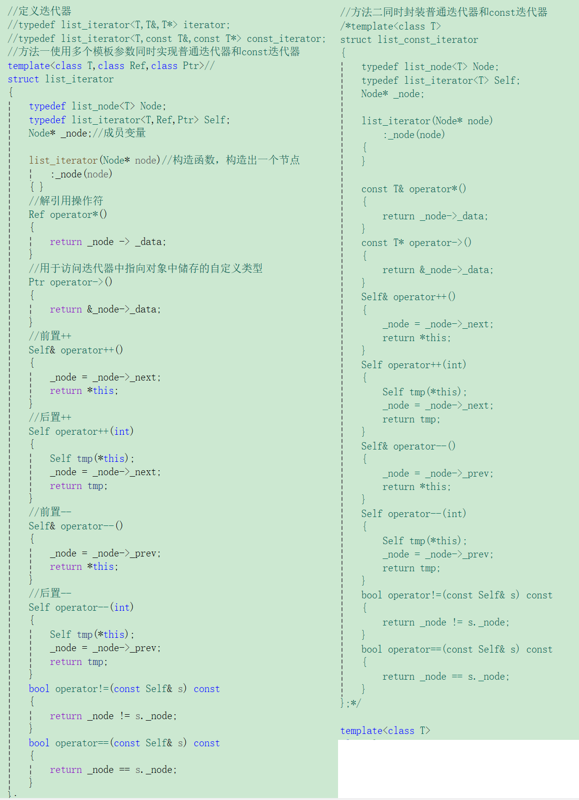 这里普通迭代器和const迭代器基本一样,只是对于(*)解引用操作得到和(->)操作得到的返回值不同怎么解决呢?方法一:对两种迭代器分别进行封装(不好代码冗余,可读性很差)。方法而:使用多个模板参数,对于不同返回值分别使用一个模板参数【两种从效率上没有差别,只是代码可读性不同】