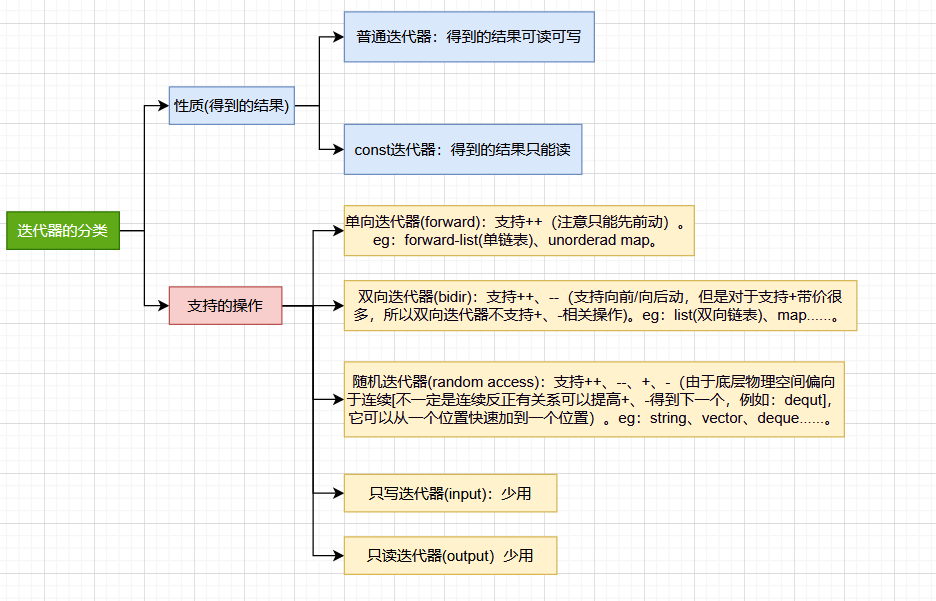 迭代器的核心功能是(*)解引用可以得到指向位置的数据,++可以向前挪动 ,vector,string都是用原声指针作为迭代器 ,因为它们的底层结构是数组 使用原声指针作为迭代器就可以满足得到迭代器的核心功能,而list如果将原声指针作为迭代器,由于list底层的每个结点不像前面两一样是数组直接是连续的(有联系),此时就满足不了迭代器的核心功能,所以list要对迭代器进行包装,进行运算符重载来满足迭代器的核心功能。是否能使用原声指针作为迭代器,还是要自己包装迭代器实现,是要看是否能满足迭代器的核心功能。