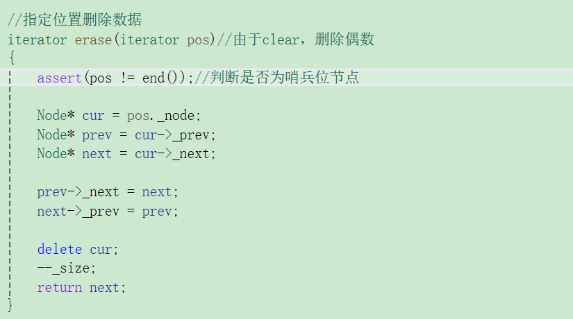 思路: 一定要注意哨兵位节点是不能删除的,将待删除节点的前后节点用一个变量储存(由于这里已经用变量进行储存,所以连接顺序就没有向后要求),然后将pos出节点删除,在将pos处前后节点连接起来,最后--size即可。