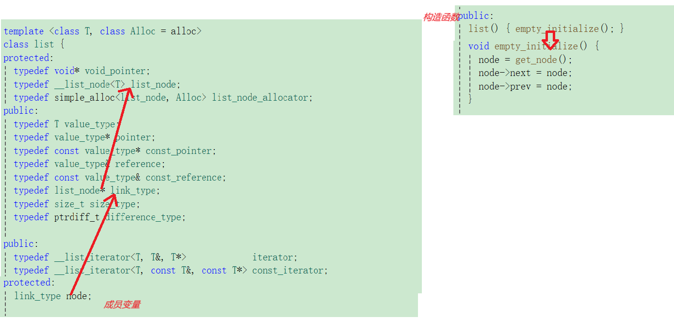 这里我们通过SGI库中list的成员变量和构造函数来验证,取底层数据结构是带头双向链表。