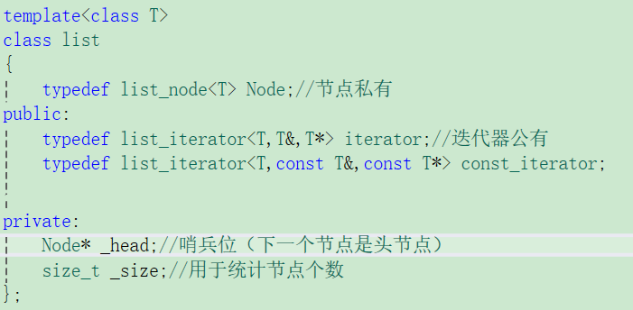 list模拟我们和库一样,给一个头节点,还可以加一个统计节点个数的变量_size(方便我们后续得到节点个数,其实可以不定义这个变量,可以通过遍历计算节点个数,为了方便这里还是定义这个变量)。由于接口都是通过迭代器进行访问,所以我们对两个迭代器进行重命名,一方面为了统一接口(string、vector等接口都一样),另一方面屏蔽底层的变量和成员函数的属性。