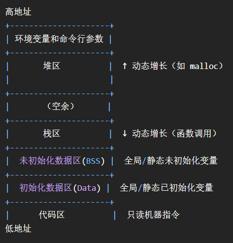 静态区(Data Segment):包含初始化的全局/静态变量、未初始化的全局/静态变量(BSS),生命周期贯穿整个程序。