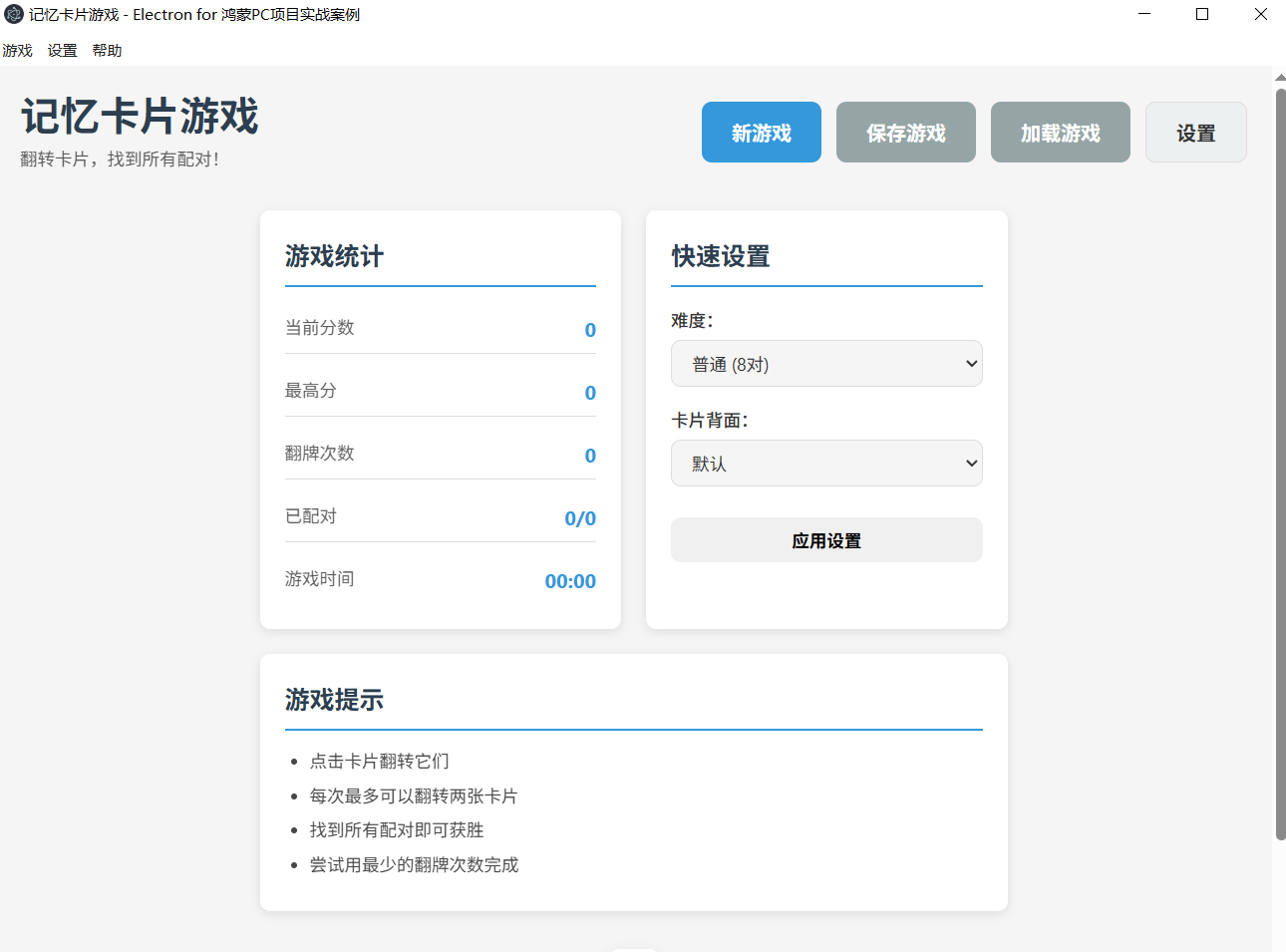 这是一个基于Electron for 鸿蒙PC的记忆翻牌游戏实现,专为初学者设计。玩家需要翻转卡片,找到匹配的一对,锻炼记忆力和专注力。游戏支持不同难度级别和多种卡片主题。