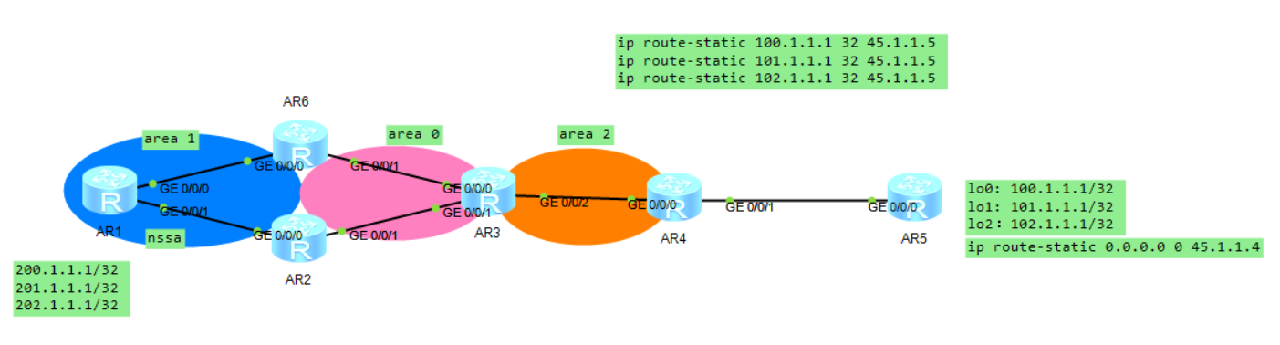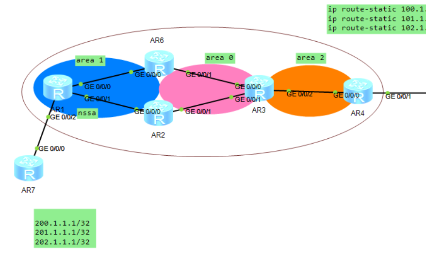 如上图所示的网络拓扑图中,区域一被设置成了一个nssa区域,它希望自身要引入外部路由200.1.1.1/32 201.1.1.1/32 202.1.1.1/32这三条外部路由,但它又不希望处理外部路由,我们就可以将区域1设置为nssa 区域。