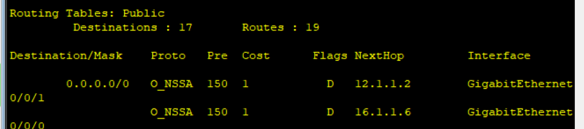 nssa 区域内的路由器访问其他外部路由时,ABR路由器会产生一条七类缺省LSA,帮助nssa内部路由器计算出缺省路由,下一跳指向ABR路由器。