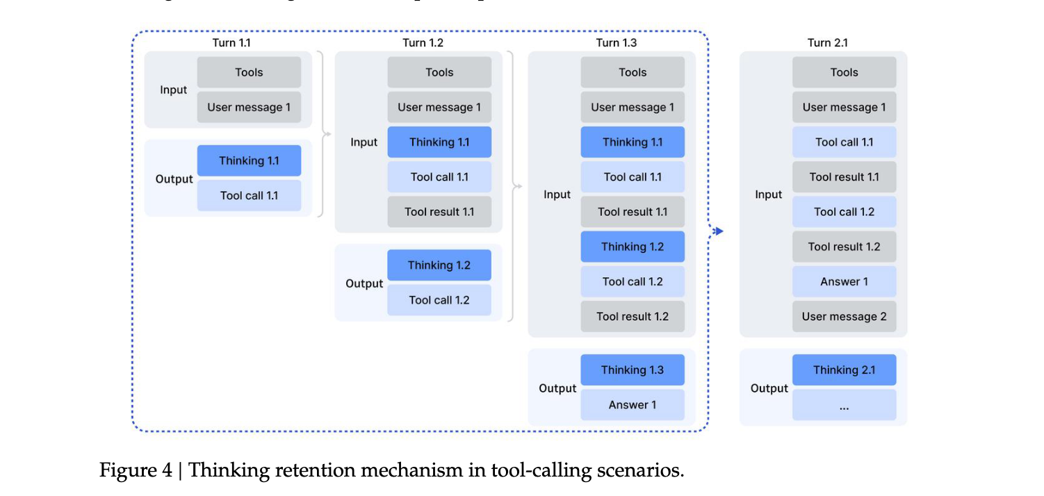 上下文管理:针对工具调用场景开发了专门的上下文管理策略,仅在新用户消息引入对话时才丢弃历史推理内容。如果仅追加工具相关消息,推理内容会在整个交互过程中保留,从而显著提高token效率。